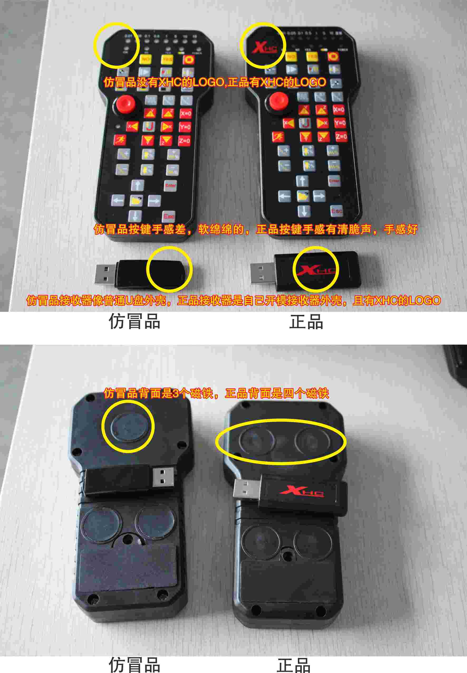 我 們公司于2014年4月底已全部停止二代維宏無線手柄WHB02的生產(chǎn),現(xiàn)在市面上出現(xiàn)了一大批仿冒我們公司W(wǎng)HB02的產(chǎn)品,不僅出現(xiàn)在一些機(jī)床附件代 理商處,還堂而皇之的出現(xiàn)在淘寶上公開叫賣,這是對我們公司的公開挑戰(zhàn),請廣大用戶擦亮眼睛,認(rèn)清他們的真面目?,F(xiàn)在我們將正品維宏無線手柄與仿冒手柄的 的區(qū)別圖片公布出來,不要購買仿冒產(chǎn)品,一旦出現(xiàn)質(zhì)量問題,將投訴無門,不要圖便宜,而讓仿冒品橫行。